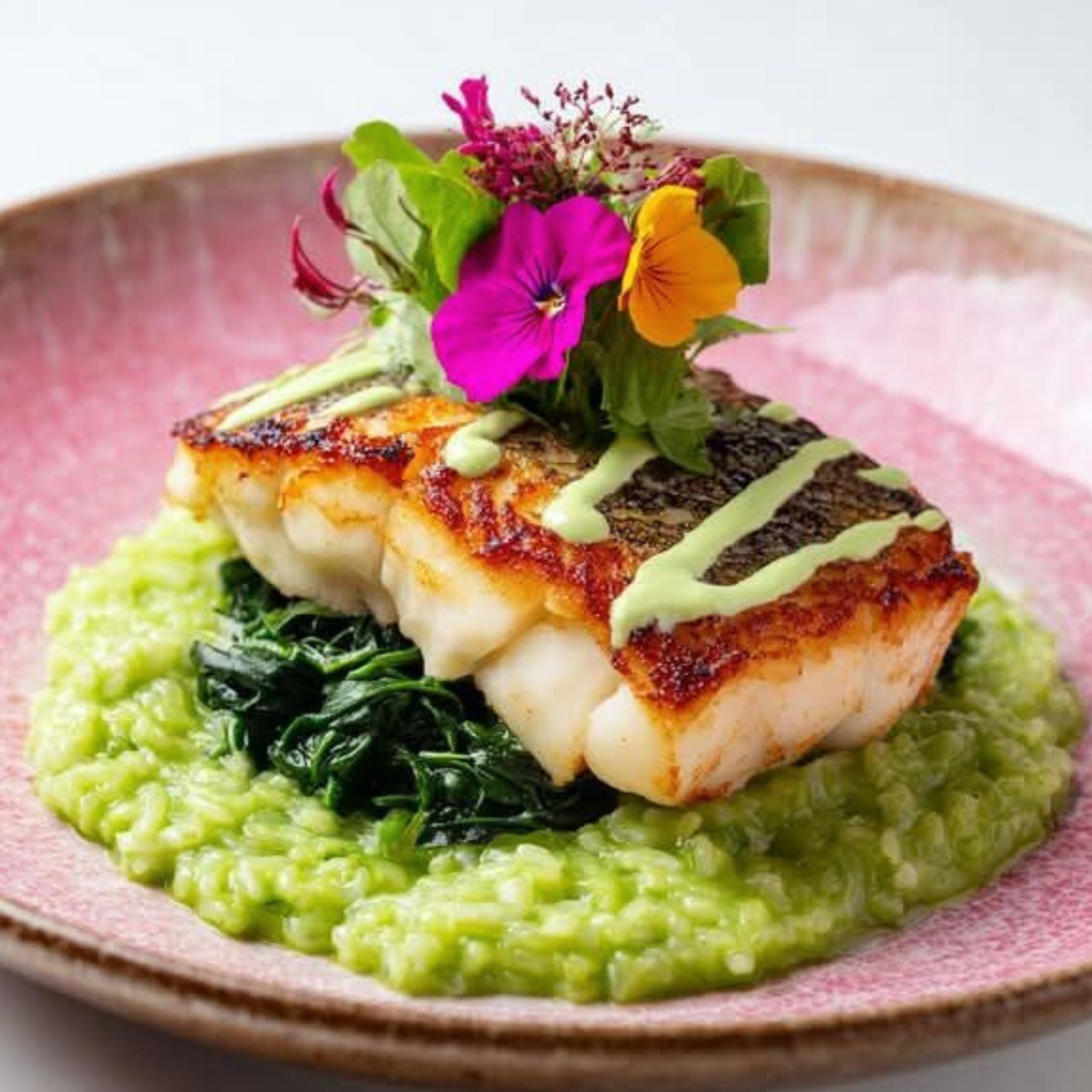 Hauptgang mit zartem Kabeljau, cremigem Risotto und frischem Spinat